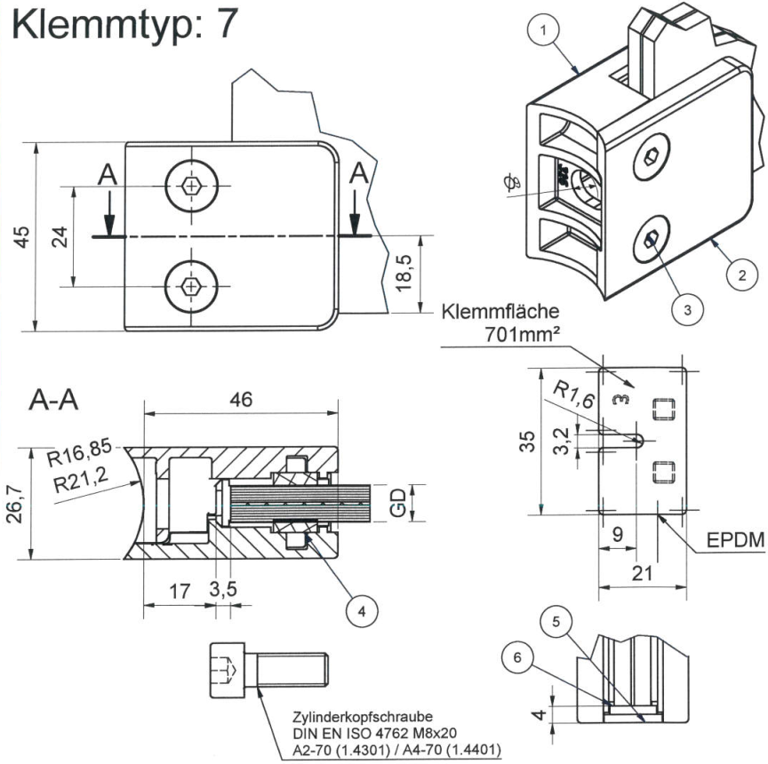 Edelstahl Korn 240 matt, ohne Sicherungsstift, Maße: 47 x 45 mm, inklusive EPDM Einlagen, mit AbZ Z-70.5-248 geprüft nach DIN 18008-4(Kategorie C1) |