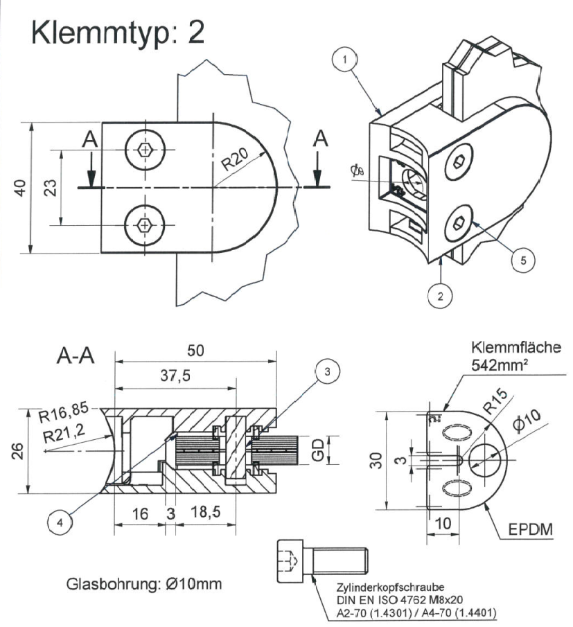 Edelstahl Korn 240 matt, Maße: 50 x 40 mm, mit Sicherungsstift, (bei Verwendung mind. Ø 10 mm Glasbohrung) ,inklusive EPDM Einlagen, mit AbZ Z-70.5-248 geprüft nach DIN 18008-4(Kategorie C1) |
