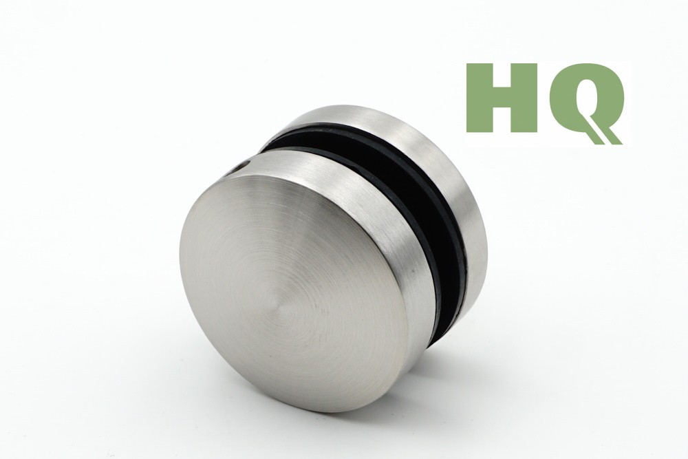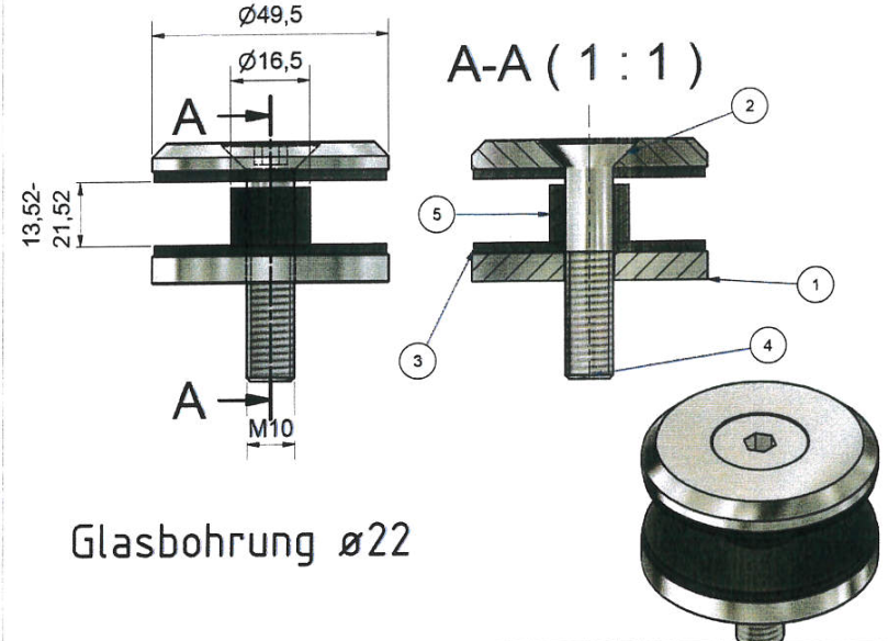 Edelstahl 1.4301 fein gedreht matt A2, Maße: Ø 49,5 mm, Unterteil mit Gewinde M10, Glasstärke 13,52-21,52 mm, Anschluss Flach |