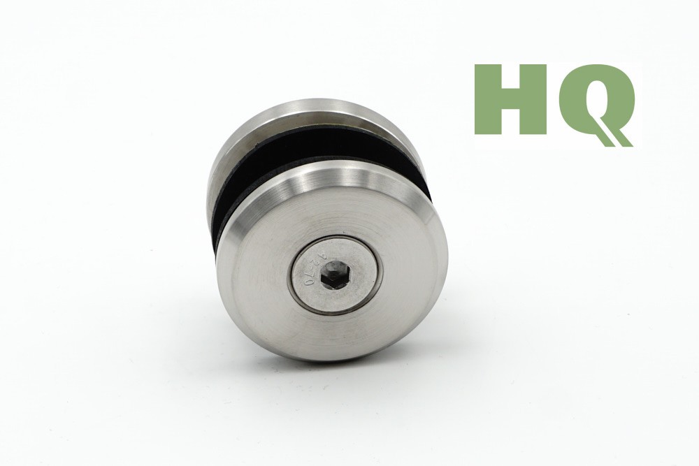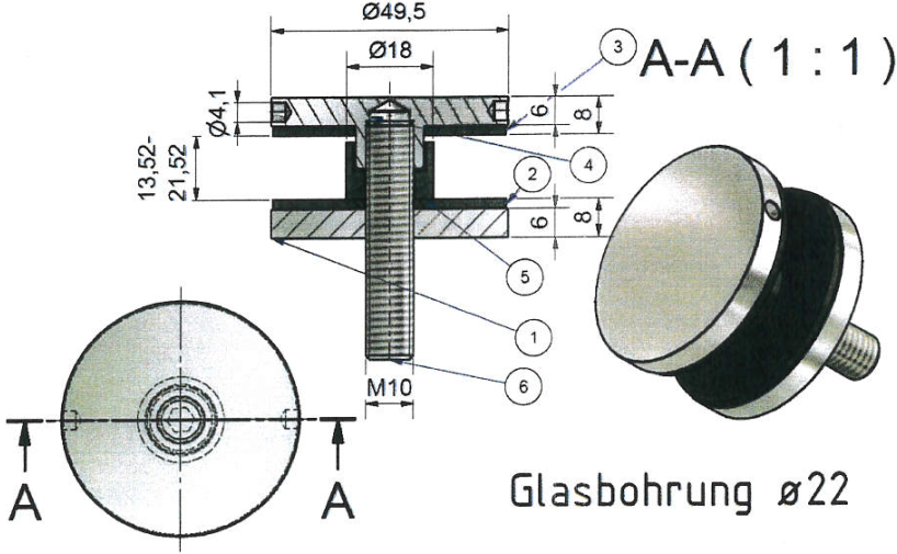 Edelstahl 1.4301 fein gedreht matt A2, Maße: Ø 49,5 mm, Anschluss: Flach, Unterteil Bohrung (ohne Gewinde), Glasstärke 13,52-21,52 mm |