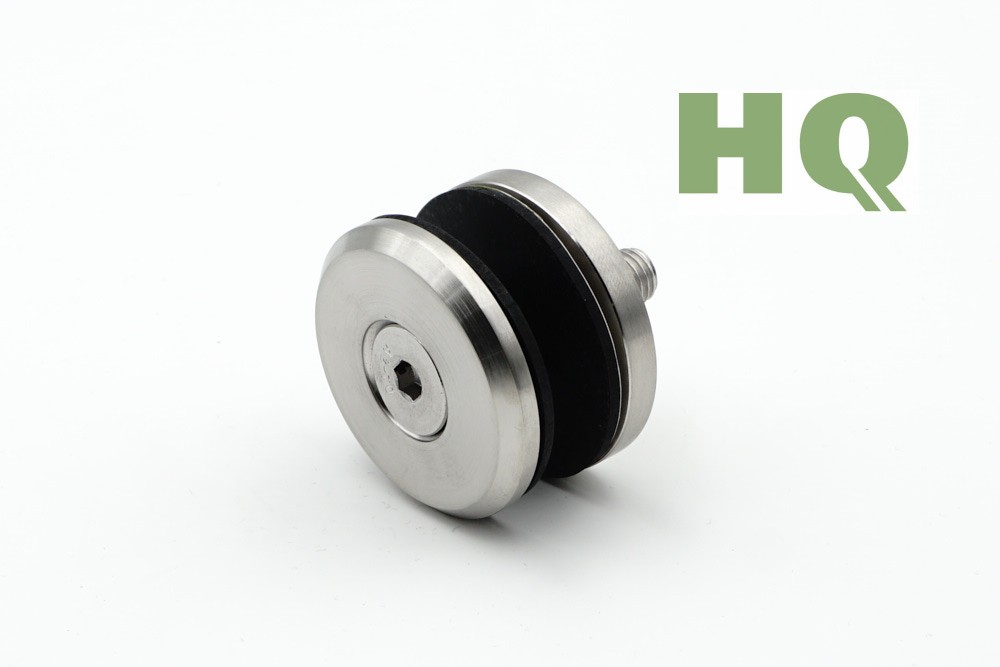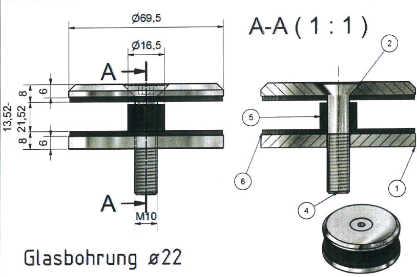 Edelstahl 1.4301 fein gedreht matt A2, Maße: Ø 69,5 mm, Anschluss: Flach, Unterteil Bohrung (ohne Gewinde), Glasstärke 13,52-21,52 mm |
