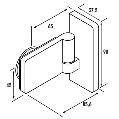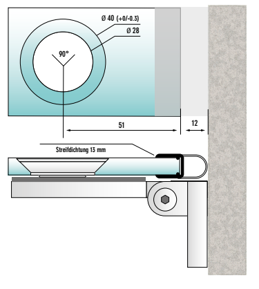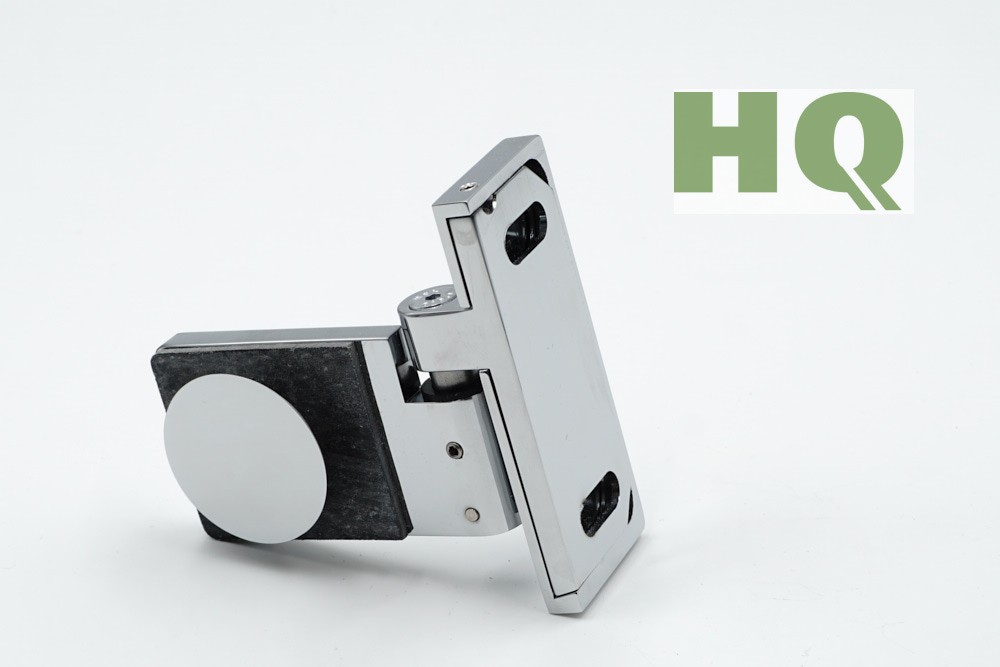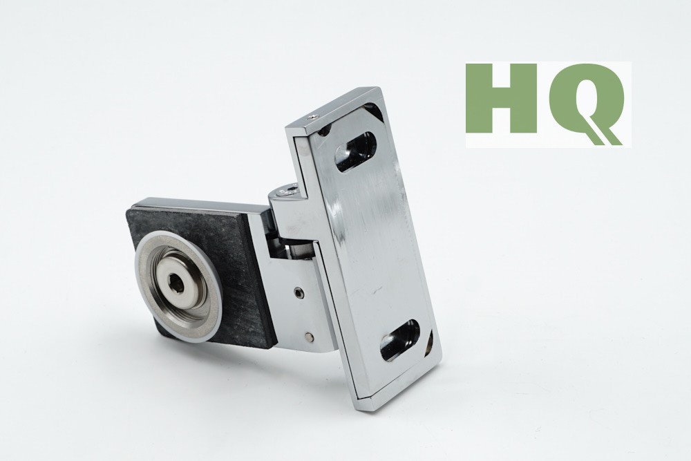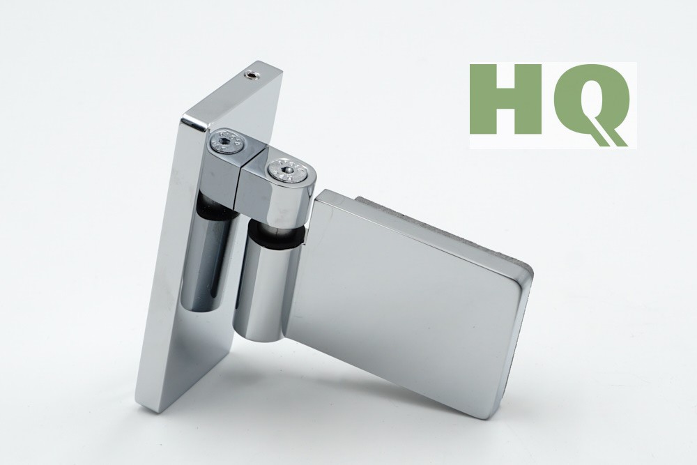 Scharnier Glas-Wand 90° mit Hebe-Senk Mechanismus; DIN rechts außen öffnend; Nullage einstellbar; Abhebung: 4 mm; Mit Aushebelschutz; Flächenbündige Glasbefestigung mit verdeckter Verschraubung; Glasart: 8 mm ESG; Tragkraft: 50 kg bei zwei Bändern; Türbreite max: 1000 mm; Abhebung: 4 mm; Material: Messing massiv; Verwendung: rechts; Verstellbarkeit im Konus: ± 2.5 mm; Oberfläche: glanzverchromt; Wandverschraubung im Langloch mit Abdeckung |