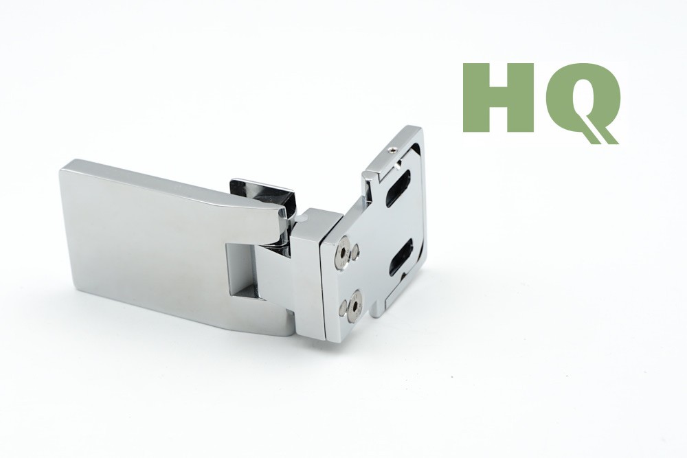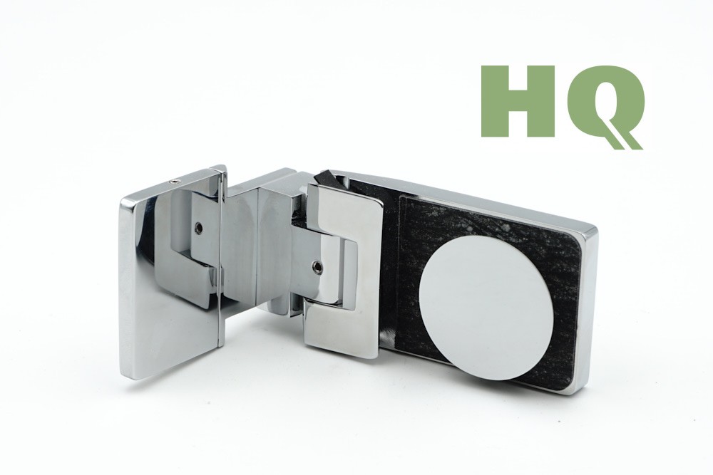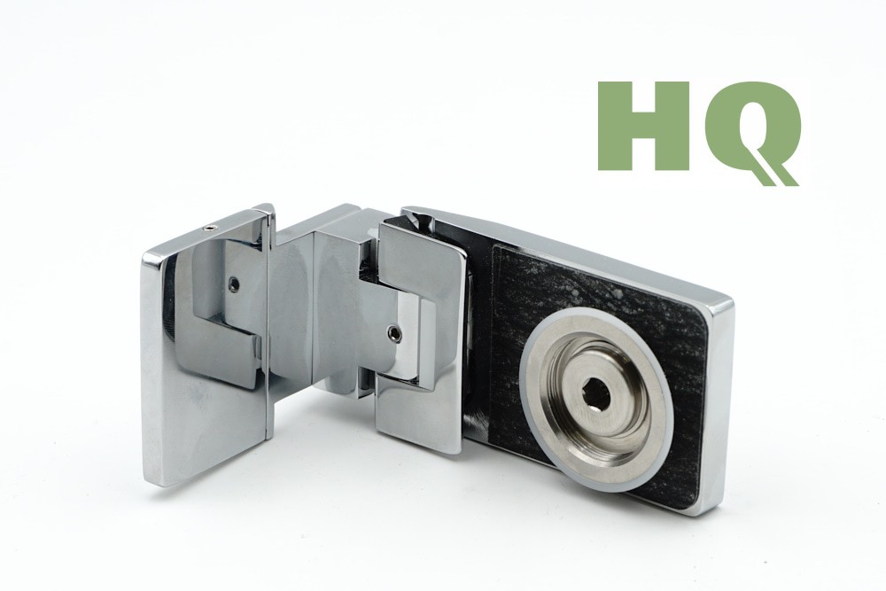 Pendelscharnier Glas-Wand 90° mit drehbarer Anschaubplatte (innen-außen); Verschraubung im Langloch mit Abdeckung; Flächenbündige Glasbefestigung mit verdeckter Verschraubung; Glasart: 8 mm ESG; Tragkraft: 40 kg bei zwei Bändern; Türbreite max: 900 mm; Material: Messing massiv; Verwendung: links/rechts; Verstellbarkeit im Konus: ± 2.5 mm; Verstellbarkeit im Langloch: ± 4.0 mm; Oberfläche: glanzverchromt |