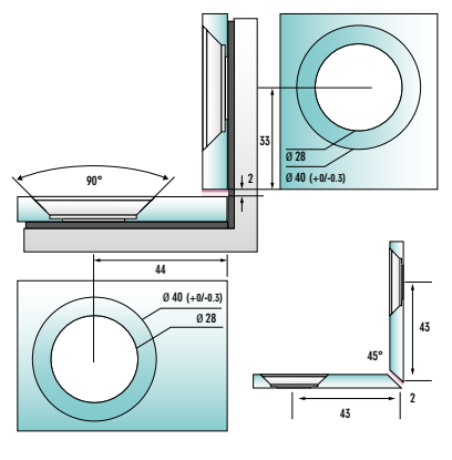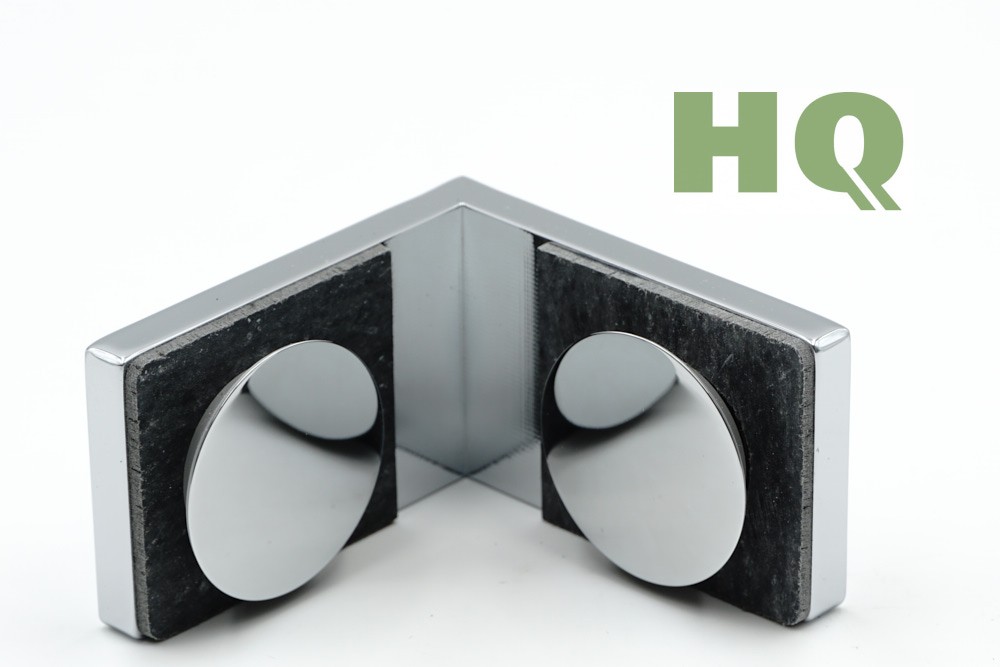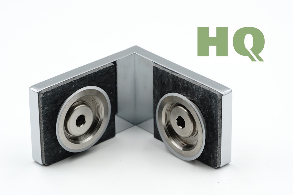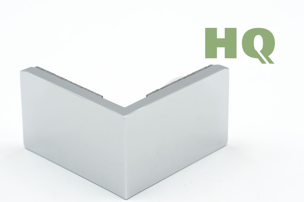 Winkelverbinder Glas-Glas 90°; Flächenbündige Glasbefestigung mit verdeckter Verschraubung; Glasart: 8 mm ESG; Material: Messing massiv; Verwendung: links/rechts; Verstellbarkeit im Konus: ± 2.5 mm; Oberfläche: glanzverchromt |